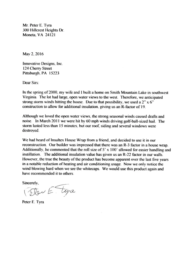 “I am writing to express my appreciation for your Insultex House Wrap. I recently purchased a home in Franklin County, Virginia which I had totally rebuilt. One of the first things we did was to remove the old siding and then wrap the house with your Insultex House Wrap. During the entire winter, my contractors were working on the inside of the house without the benefit of an operable HVAC system. We depended solely on a small portable space heater for heat. The workers and I were amazed at how easy it was to heat the home with such a small heater and how well the home maintained its heat. I attribute this to the excellent insulating properties of your product. As expected, I am very pleased with the performance of your house wrap product.”