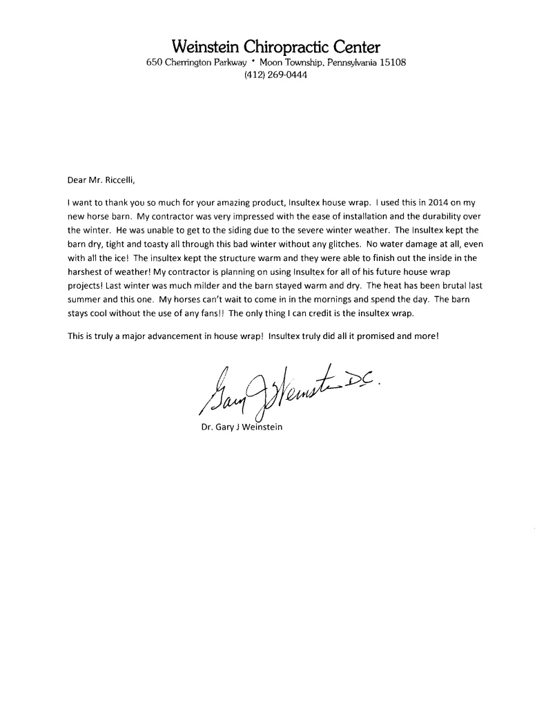 “I want to thank you so much for your amazing product, Insultex House Wrap. I used this in 2014 on my new horse barn. My contractor was very impressed with the ease of installation and the durability over the winter. Insultex House Wrap kept the barn dry, tight and toasy all through this bad winter. No water damage at all, even with all the ice! Insultex House Wrap kept the structure warm and they are able to finish out the inside in the harshest of weather! This is truly a major advancement in house wrap. Insultex truly did all it promised and more!”